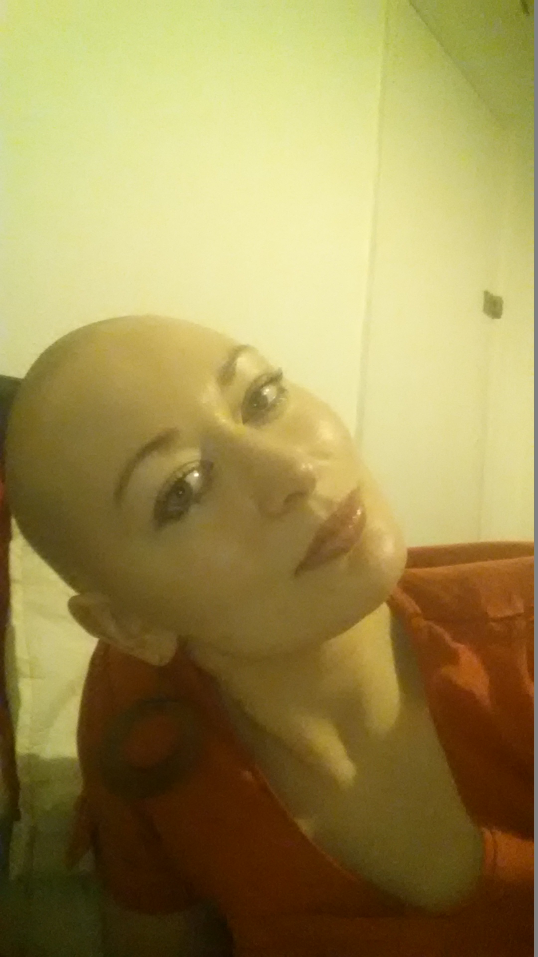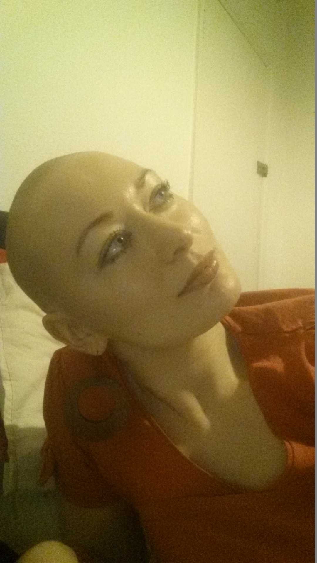 Ho indossato la parrucca solo per due giorni quando ho deciso di rasare la mia testa perche’ ormai avevo perso troppi capelli e volevo avere controllo del mio aspetto. Quindi mio fratello è venuto a rasarmi i cappeli e quel momento l’ho chiamato “Thelma e Louise”, quando nel film si tengono per mano in macchina prima di saltare da un dirupo. Avevo cercato su internet ispirazione e foto di persone pelate e orgoliose, ma non ho trovato nulla che mi confortava nel salto dell’ignoto. Ero nervosa; cosa succedera’ se io sembrassi come un uovo, se io non avessi una bella forma di testa. Il pensiero non ha mai attraversato la mia mente che avrei potuto uscire in pubblico con la testa calva. Pensavo di essere condannata a nascondermi sotto la mia parrucca per i prossimi 6 mesi in attesa che i capelli ricrescono.