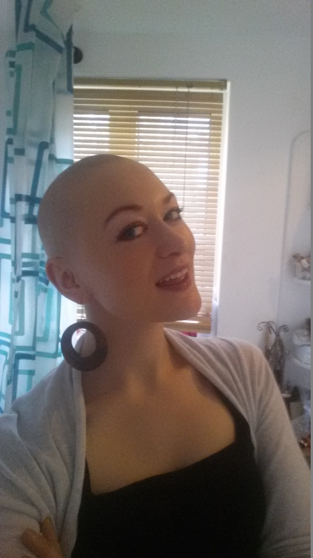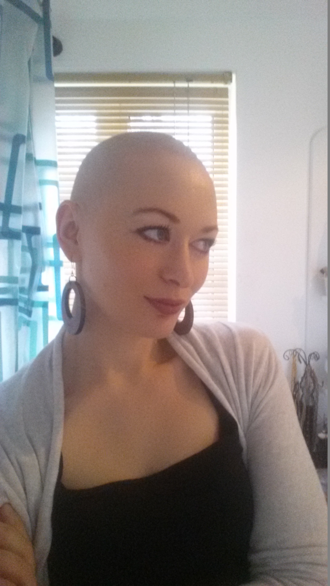 E’ il giorno dopo la rasatura, quando mi alzo per prepararmi, mi sento ringiovanita ed eccitata come la mattina di Natale! Non vedo l’ora di scoprire il mio nuovo look. Stranamente, ho dovuto mettere i miei orecchini prima di fare il mio trucco. Non so perché, forse per abbinare ed essere in simmetria!