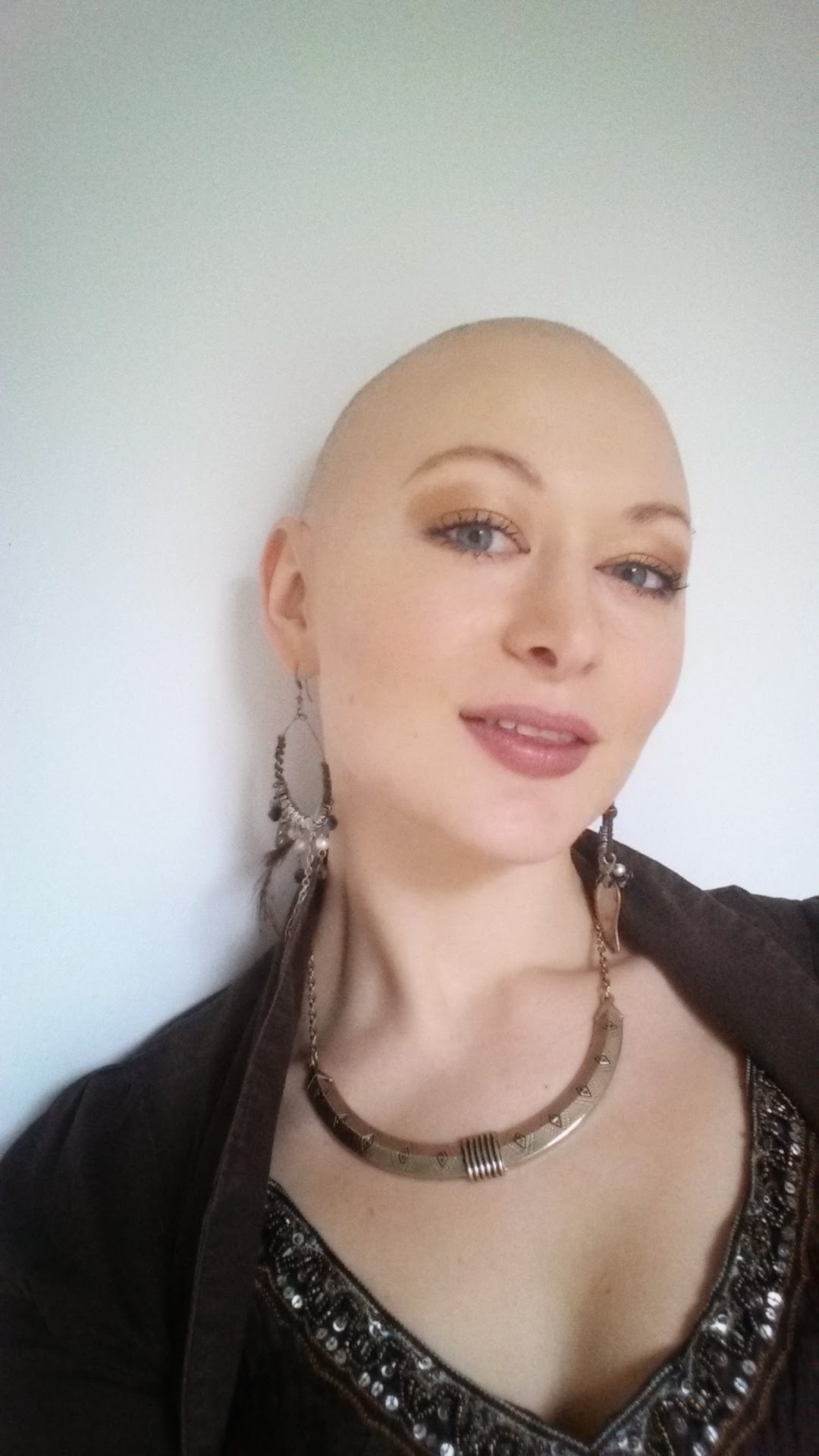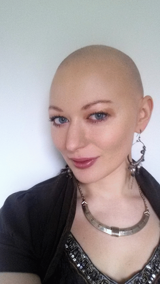 Un appuntamento all’ospedale con il mio medico, per una consultazione pre-chemio, può significare solo una cosa: Essere favolosa! Riesco a valorizzare i miei lineamenti con il trucco, quindi non ho bisogno della parrucca. Ma oggi ho deciso di fare un passo avanti. Siccome i miei capelli cadono continuamente, ho deciso di applicare dell’ombretto nero in tutto la testa e creare un’ombra di capelli. Il trucco e’ veramente diventato la mia parrucca!! Ricorda sempre di mettere un pennello grande ed un ombretto nero nella tua borsa in modo da riapplicarlo durante la serata.